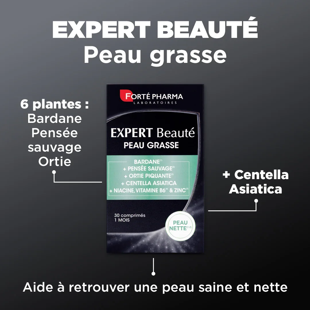 Expert Beauté Peau Grasse associe des plantes reconnues pour purifier comme la Bardane et la Pensée sauvage pour aider à retrouver une peau nette et saine(1)(2) et complété par des vitamines B2, B6, C & E et du zinc.