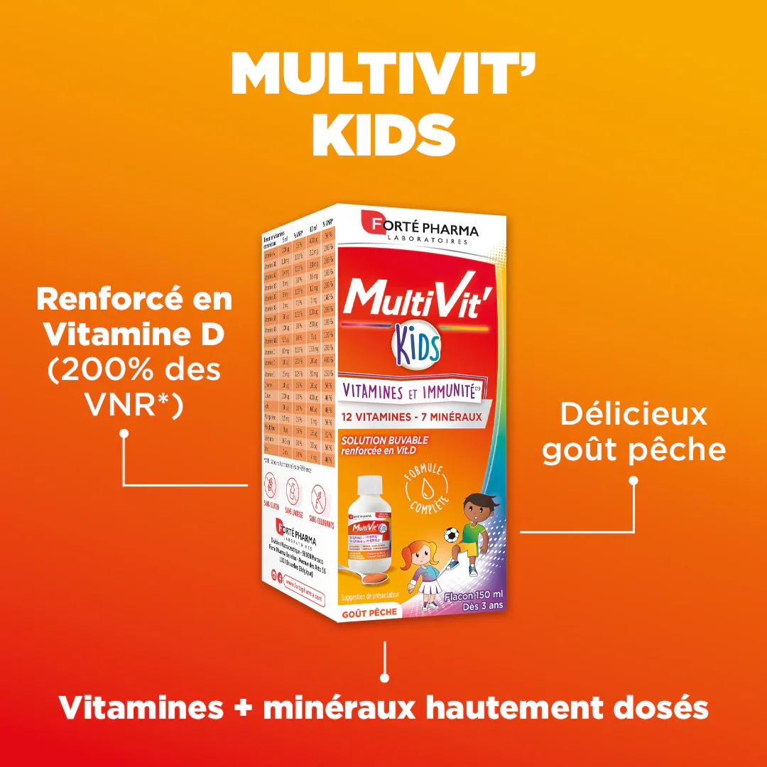 Parce qu'il n'y a pas que les grands qui ont besoin d'un coup de pouce pour rester en forme ! Multivit'Kids Solution buvable c'est notre solution multivitaminée facile à prendre dès 3 ans et au bon goût pêche.