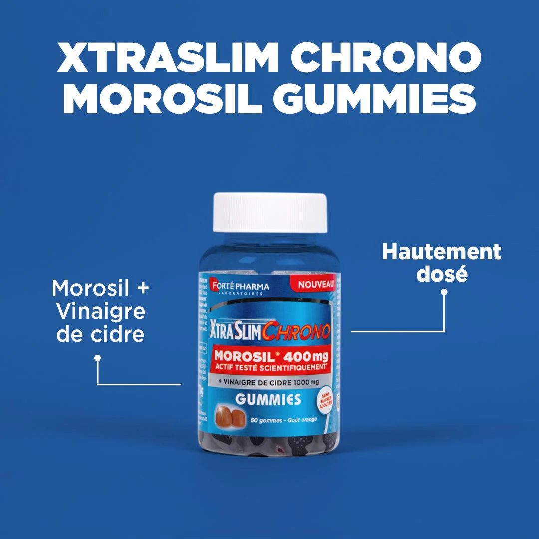 Le MOROSIL® est un actif testé scientifiquement*, issu d'oranges sanguines. Ces études démontrent des bénéfices sur la silhouette. Pratique et au bon goût orange, XtraSlim Chrono Gummies est sans sucres ajoutés**.